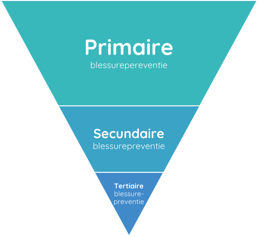 We kiezen bewust voor een omgekeerde piramide, ter illustratie van de verschillende preventie niveaus: primaire blessurepreventie is het belangrijkste niveau om als sporter, sportprofessional of sportorganisatie op in te zetten.